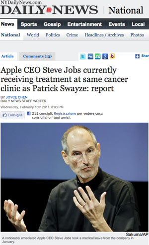Questo accanto è il Daily News, guardatelo bene con tanto di testata, perché lo ritroveremo come il prezzemolo, ma al pari dei cavoli a merenda. La stampa italiana si è concentrata qui, su una vecchia foto di Steve Jobs (scattata da Sakuma dell’AP, ma si sa che i crediti nei giornali italiani valgono zero, eppure si affannano a mettere il simbolo del copyright ovunque, anche sui comunicati stampa copiati ed incollati), già magro, ma non certo quella che poteva corredare la notizia/non notizia del settimanale gossiparo.