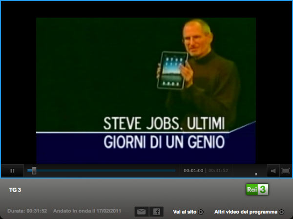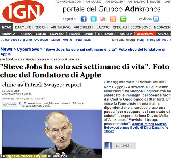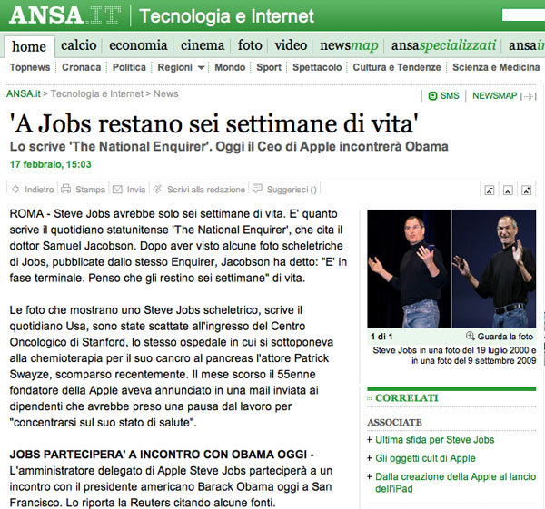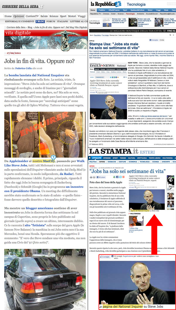 Aggiornamento del 17/02/2011: in serata si sono svegliati anche i vari telegiornali e le loro interpretazioni stanno arrivando in questi minuti. Ecco come ha presentato l’argomento il TG3 delle ore 19 (streaming): “ultimi giorni per Steve Jobs” e nessun accenno al tipo della fonte. La presentazione del servizio del direttore Bianca Berlinguer è anche peggio: “Steve Jobs non ce l’ha fatta […] e Barack Obama in un estremo omaggio lo ha raggiunto in California”. Nessuna spiegazione di cos’è il National Enquirer e tante banalità su Jobs direttamente dall’inviata Giovanna Botteri.