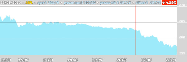 Apple ha perso in quel giorno poco meno del 5% ed oltre 10 dollari, scendendo sotto ai 200 dollari per la prima volta dal 22 dicembre e chiudendo a 197,75 dollari.
