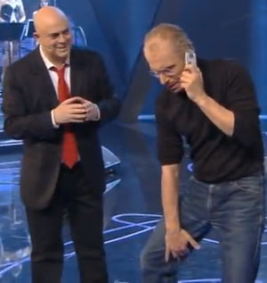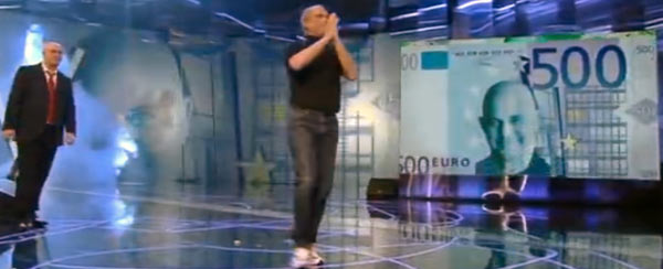 Crozza introduce l’uomo che “trasforma il silicio in oro” (da qui le banconote proiettate in studio, alle loro spalle) ricordando che in settimana un ingegnere di Apple ha smarrito il prototipo di un iPhone.