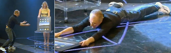 Ma è giunto il momento dell'”iPak” che entra in studio, in versione sempre più grande, questa volta su un carrello. Prima Jobs dice che è un oggetto sottile e leggero, ma poi cade in terra quando lo prende in mano.