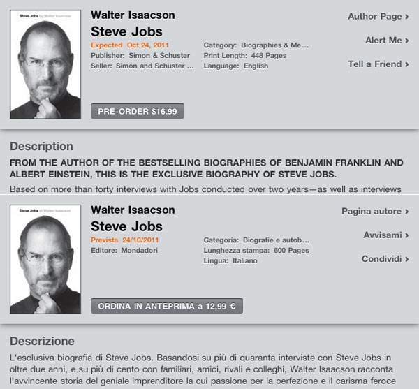 La biografia di Steve Jobs scritta da Walter Isaacson uscirà prima del previsto, non più a fine novembre o più tardi ma il 24 ottobre, anche in Italiano edita da Mondadori. Le prenotazioni su Amazon ed altri negozi online si erano impennate incredibilmente nelle ultime ore. Su Fortune leggiamo che il prossimo numero di Time sarà dedicato a Jobs, per la settima volta in copertina. Ci viene regalato anche un breve estratto dell’imminente biografia: Isaacson nel 2004, dietro la richiesta di una biografia fatta direttamente da Steve Jobs, si era rifiutato di accontentarlo perché “era troppo presto per il CEO di Apple”, ma ancora non sapeva dei guai fisici che lo hanno poi colpito duramente negli ultimi anni.