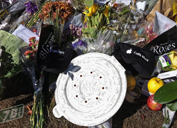 Qui è sabato pomeriggio, siamo arrivati a Cupertino per testimoniarvi cosa sta accadendo e per mostrare prova fotografica che i vostri messaggi inviati in redazione fino alla scorsa mezzanotte (italiana) sono in buone mani, quelle del destino. Il memoriale spontaneo nato qui accoglie anche il volume con i vostri ringraziamenti e saluti.