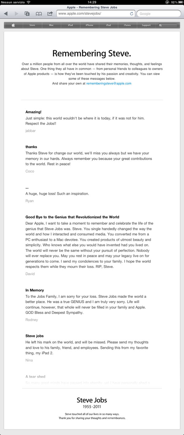 Dal 19 ottobre Apple ha iniziato a far scorrere i selezionati messaggi della gente tra quelli ricevuti nei giorni scorsi. Sono tutti scritti in inglese, abbiamo quindi previsto bene le intenzioni di Apple chiedendovi di inviarceli, li abbiamo portati direttamente sul posto come hanno testimoniato le nostre precedenti fotografie. Apple ha anche registrato il 5 ottobre il dominio rememberingstevejobs.com, che rimanda direttamente alla pagina apple.com/stevejobs. A partire dal 20 ottobre la home page di Apple ha tolto l’immagine di Steve Jobs ed ha messo quella degli iPhone 4S. Ovviamente le home page internazionali del sito di Apple sono indietro, come in quella italiana nulla cambia ed i messaggi, o in lingua locale o la semplice replica dello scorrimento dei messaggi in inglese, ancora non si sono visti. E’ tutto finito, è tutto messo da parte, il business deve ricominciare.