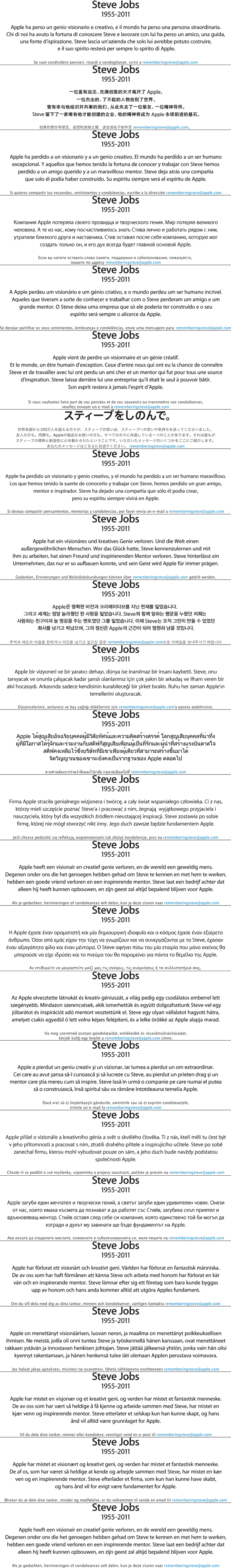 Ecco tutte le lingue tradotte da Apple (che si è tenuta lontana dalle varie indiane, quelle africane ed alcune asiatiche, dove è stato imposto l’inglese) per chiedere le commemorazioni personali, tanto poi saranno pubblicate solo quelle testuali ed in inglese.