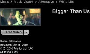 Ricordando che dall’8 febbraio sarà disponibile in esclusiva anche la raccolta di musica rimasterizzata dei Beatles, trasferiamoci sulla versione statunitense di iTunes Store. Il primo regalo è il videoclip “Bigger than us” di White Lies, ma ce n’è anche un secondo e si accompagna alle immagini in HD della serie di Sony per FX “Justified“.