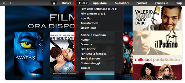 Ebbene, la novità di oggi è che finalmente si legge la voce di menu “film” tra “musica” ed “App Store”. Mancava solo questo, finalmente anche chi si fa sfuggire la rotazione dei banner con link ai film li potrà raggiungere direttamente.