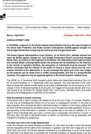 Il garante della privacy elvetica nell’agosto del 2009 aveva raccolto centinaia di proteste di cittadini svizzeri, riguardo alle foto messe online da Street View. Google aveva rigettato le accuse e si era finiti in tribunale.