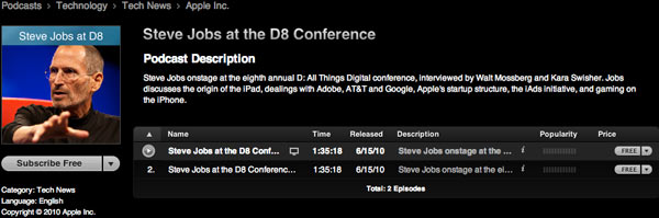 Nella sezione podcast si trovano sia l’audio che il video di Steve Jobs alla conferenza D8, per una durata di 95 minuti (1,09 GB il filmato) di qualche giorno fa, si noti che il filmato ha il copyright di Apple e non del Wall Street Journal, che organizzava l’evento. Difficile capirne le ragioni ma deve essere stata la condizione per la partecipazione del CEO di Apple, nonostante quanto raccontato dai responsabili del giornale economico.