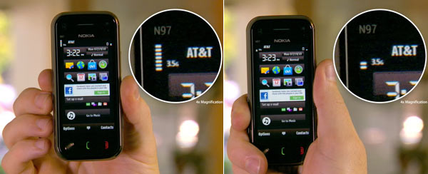Ecco l’ultimo arrivato tra i test comparativi fatti da Apple su RIM BlackBerry Bold 9700, HTC Droid Eris con Android e Samsung Omnia II con Win Mobile, oltre ad iPhone 4 ed iPhone 3GS. Le 7 barre scendono fino a 2 quando si copre completamente l’antenna inferiore del Nokia (quindi il segnale risulta debole, pur senza far cadere la linea).