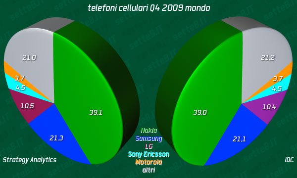 Per IDC è prima in classifica Nokia con 126.900.000 telefoni per il 39% del mercato mondiale (+12% sul Q4 del 2008, quando deteneva il 38,7%), seconda Samsung con 68.800.000 telefoni per il 21,1% (+30,3% sul Q4 del 2008, quando deteneva il 18,1%), terza LG con 33.900.000 telefoni per il 10,4% (+31,9% sul Q4 del 2008, quando deteneva l’8,8%), quarta Sony Ericsson con 14.600.000 telefoni per il 4,5% (-39,7% sul Q4 del 2008, quando deteneva l’8,3%), al quinto posto Motorola con 12.000.000 telefoni per il 3,7% (-37,5% sul Q4 del 2008, quando deteneva il 6,6%).