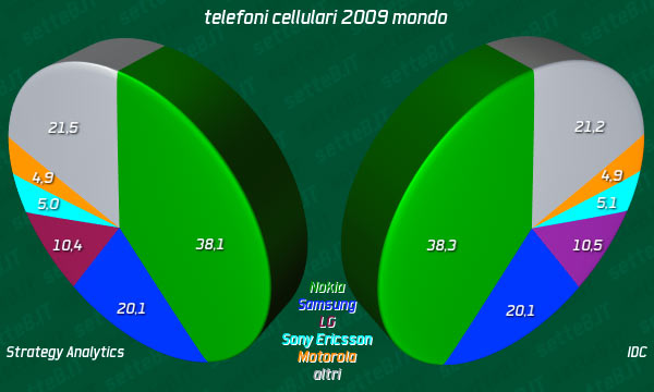 Nokia è prima con 431.800.000 telefoni per il 38,1% del mercato mondiale (nel 2008 deteneva il 39,8%), segue Samsung con 227.300.000 telefoni per il 20,1% (nel 2008 deteneva il 16,7%), terza LG con 117.900.000 telefoni per il 10,4% (nel 2008 deteneva l’8,7%), quarta Sony Ericsson al quarto posto con 57.000.000 telefoni per il 5% (nel 2008 deteneva l’8,2%), al quinto posto Motorola con 55.100.000 telefoni per il 4,9% (nel 2008 deteneva l’8,5%). Tutti gli altri produttori aumentano la loro presenza passando da 214,8 milioni a 242,8 milioni di pezzi.