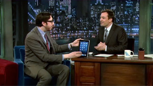 14-08557b_fallontopolskyipad2aprileTra i programmi più seguiti (forse non necessariamente dai ragazzi che più si appassionano all’ultimo gadget tecnologico), il tablet di Apple, è arrivato nelle mani di David Letterman e di Stephen Colbert, ma anche in quelle di Jimmy Fallon.