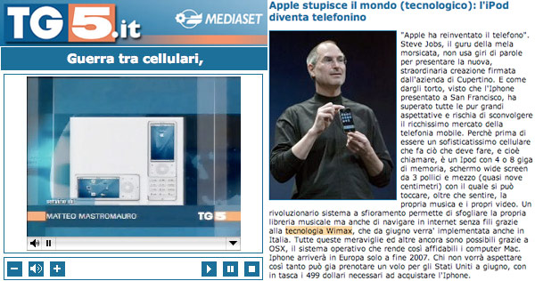 Non contenti del servizio di disinformazione qualcun altro del TG5.it ha pensato bene di storpiare anche questo nome di un prodotto di Apple: “Iphone” (per due volte ed assieme ad un immancabile “Ipod”), nella perfetta tradizione dei quotidiani italiani. Ma fosse solo per quello… qui si sono addirittura convinti che il telefono di Apple userà Wimax (che ovviamente si dovrebbe scrivere WiMAX, ndr)!