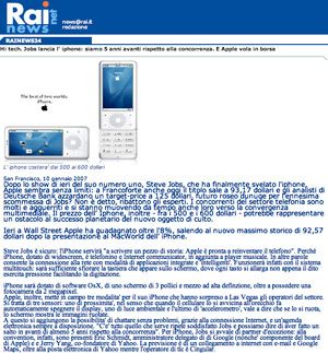Aggiornamento dell’11/01/2007: e la RAI che fa? Non abbiamo notizia dei TG ma sul sito viene commesso il medesimo errore del TG5, condito da altri. La RAI, per la precisione RAI News 24, se la prende comoda e aspetta mercoledì a scrivere qualcosa dell’iPhone (che naturalmente è chiamato “iphone”, ndr), quando ormai le informazioni erano abbondantemente alla portata di chiunque. Ebbene, oltre a mostrare l’immagine farlocca, la stessa scelta dal TG5, senza preoccuparsi nemmeno di guardare la home page di Apple, alla televisione di stato sono convinti che il “MacWorld” sia avvenuto a Las Vegas, dove invece c’era il CES, perché si legge: (l’iPhone) “ha sorpreso a Las Vegas gli operatori del settore”. E poi viene citato un presunto massimo storico del titolo in borsa di 92.57… quando invece il massimo c’è stato, ma di 97,80 dollari.