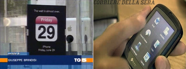 Aggiornamento del 27/06/2007: quando sbagliano lo abbiamo segnalato, ora è il caso di segnalare un ottimo servizio del TG5 che finalmente mostra le immagini giuste e racconta i fatti reali relativi all’arrivo dell’iPhone. Intendiamoci, nulla di nuovo o frutto di lunghe indagini giornalistiche, se seguite regolarmente setteB.IT sono tutte cose già lette ma, trattandosi di un telegiornale generalista e piuttosto popolare, finalmente informazioni corrette da Giuseppe Brindisi, che ne ha curato il servizio nell’edizione odierna delle ore 13. Di contro va segnalato uno dei due video presenti sul sito del Corriere della Sera (l’altro è la parodia che circola in rete da mesi) che per mostrare l’interfaccia del touch screen dell’iPhone sceglie un HTC con Windows, ogni commento sembra inutile.