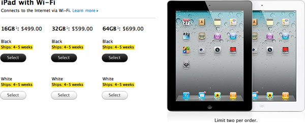 Nella notte statunitense i tempi indicati dall’Apple Store online per i nuovi iPad 2 si sono ulteriormente allungati fino a 4 o 5 settimane. Già nel day 1 del lancio del nuovo tablet, venerdì scorso, si era visto il termine di consegna cambiare ogni pochi minuti, passando gradualmente da 3/5 giorni fino a 2/3 settimane e poi a 3/4 settimane.
