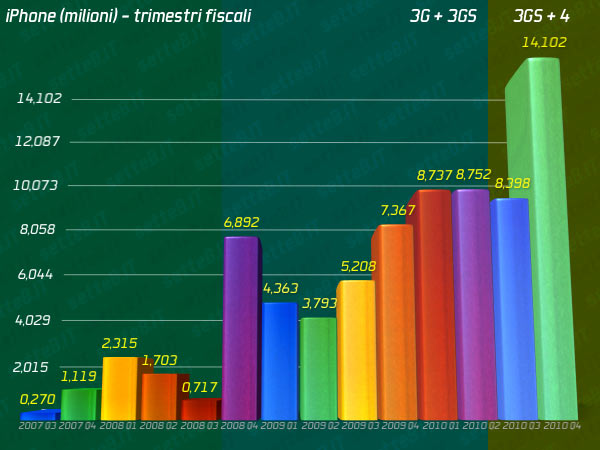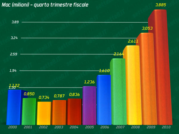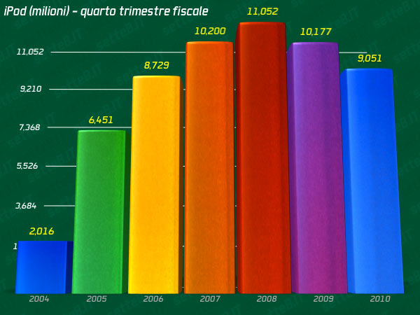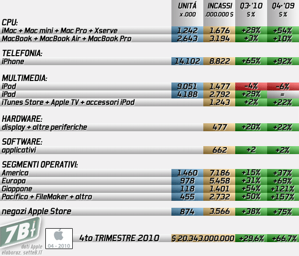 Sono stati venduti 3,885 milioni di Mac (+27% in 12 mesi), 14,102 milioni di iPhone (+91% sul Q4 del 2009), 9,051 milioni di iPod (-11% rispetto all’anno scorso) e 4,188 milioni di iPad.
