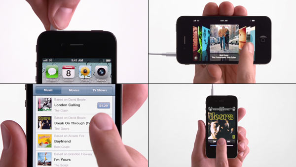 “iPod + iTunes” (anche su YouTube) simboleggia la presenza dell’applicazione musicale con l’inserimento del mini-jack dell’auricolare nella presa dello smartphone. Non solo con iPod si può sfogliare ed ascoltare la musica preferita, ma grazie ad iTunes Store (leader assoluto del mercato) ed alla funzione Genius si possono comperare le canzoni più vicine ai gusti del proprietario.