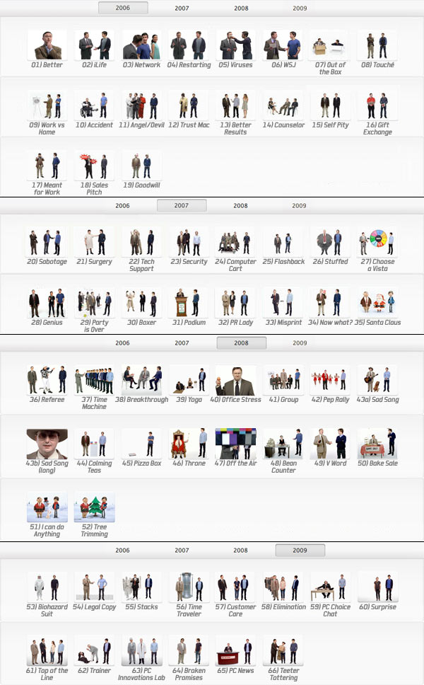 L’occasione di riassumere ancora una volta tutta la sequenza di spot ce l’ha suggerita AdFreak, che ha linkato tutti i video trovati su YouTube, anche perché Apple si è dimenticata di 20 spot, elencandone solo 46.