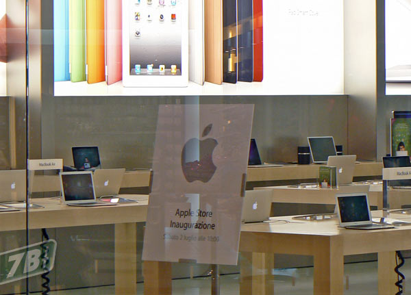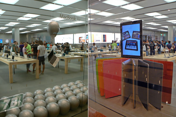 Sulle pareti laterali compaiono le insegne luminose viste in tutti gli altri 327 Apple Store, si promoziona l’iPhone, l’iPad ed il MacBook Air (anche in vetrina, assieme all’iPad), campioni di vendita di Apple. Tra pochi giorni potrebbero già essere sostituiti per promozionare l’arrivo (nel Mac App Store, non in negozio) di Lion.