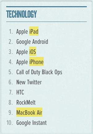 Tra 8 categorie quella tecnologica è quella ci interessa maggiormente, qui l’azienda di Cupertino sbanca. Ben 4 prodotti su 10 sono suoi, nessun altra azienda riesce a fare tanto, anzi, nessuna ha più di una voce in classifica. Al primo posto nella “technology” c’è iPad, il sistema operativo iOS è al terzo, segue l’iPhone. Il nuovo e sottilissimo MacBook Air presentato poche settimane fa ha già fatto in tempo a scalare la classifica, posizionandosi al nono posto.