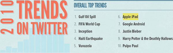 Il micro-blog da 25 miliardi di messaggi annui ha appena rivelato i trend dell’anno ed Apple agguanta la sesta posizione tra gli argomenti più discussi, grazie all’iPad.