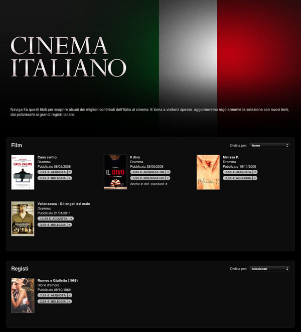 11 giorni dopo l’arrivo dei primi lungometraggi italiani nel negozio online di Apple, su iTunes Store è comparsa la pagina cinema italiano.