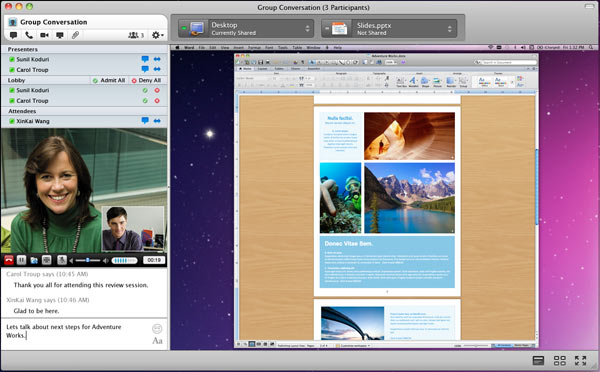 Gli utenti di multiple suite Office 2011 per Mac potranno presto usare il sistema di comunicazione unificata (audio, video, testo, condivisione scrivania e pure telefonia, come si può vedere accanto), destinato soprattutto alle aziende che si appoggiano a Lync Server 2010 o Lync Online (Office 365)