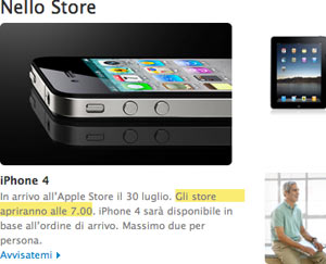 Solo le pagine dei negozi di Apple anticipano che gli Apple Store inizieranno la distribuzione all’alba, addirittura 60 minuti prima dell’orario che Apple aveva stabilito per il primo lancio dell’iPhone 4 in Francia (che aveva aperto a mezzanotte in location chiave), Germania, Giappone, Gran Bretagna e Stati Uniti.