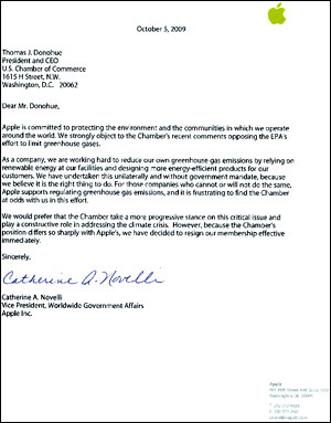 Apple (per l'occasione il logo era verde) ha scritto una lettera con la quale esce immediatamente dalla camera di commercio statunitense perché, se le regole cambiano (blande limitazioni alle emissioni gassose), queste dovrebbero essere concordate tra i membri e non imposte in modo unilaterale dal presidente Thomas Donohue.