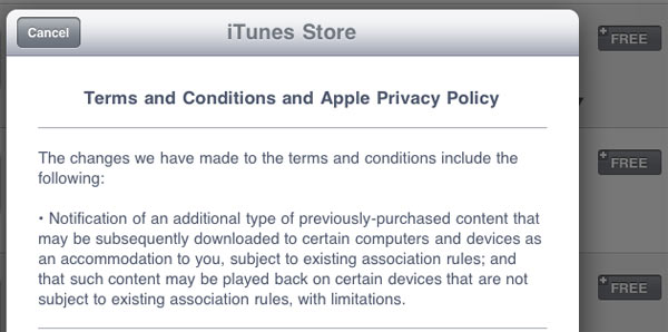 Aggiornamento del 02/08/2011: come vedete dall’immagine sottostante, anche i termini d’uso di iTunes Store USA sono stati modificati per consentire legalmente lo streaming video a “certi dispositivi”.