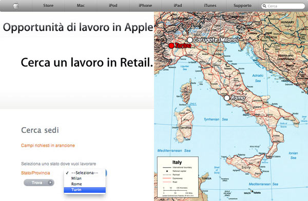 E’ apparsa sulle pagine della ricerca di personale di Apple l’indicazione di Torino in aggiunta a quelle di Roma e Carugate (Milano).