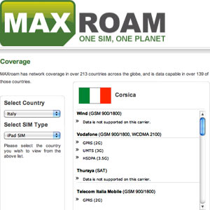 MAXroam si appoggerà alle reti di Vodafone e Wind (ce lo hanno confermato da Cork). All’appello manca TIM, nonostante quello che dice un sito poco attento all’Italia (indentificata da, più o meno, la nostra bandiera e dall’indicazione “Corsica”!).