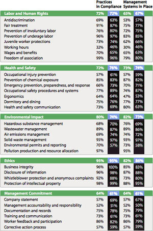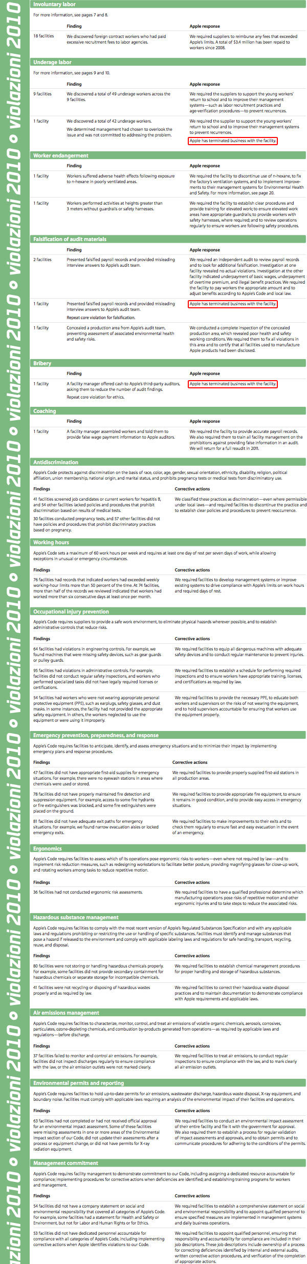 Accanto sono mostrati i risultati del 2010, confrontati con quelli del 2009 nelle strisce di colore scuro. Valutate da soli se si tratta solo di miglioramenti. Qui sotto la lunga lista delle violazioni maggiori e secondarie scoperte da Apple, con gli eventuali provvedimenti presi dall’azienda di Cupertino. C’è ancora molto da fare per avere la coscienza pulita.