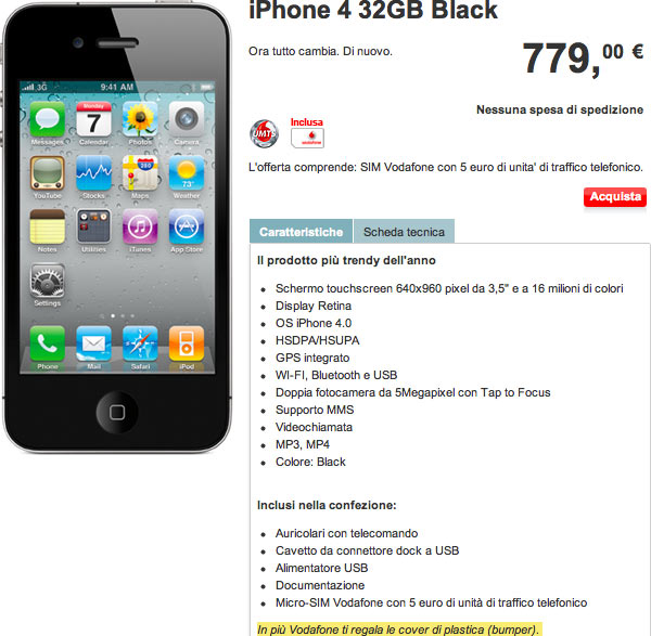 Tuttavia, la situazione dei prezzi degli iPhone 4 senza contratto nel nostro bastonatissimo paese è la seguente, per chi se la fosse persa finora: 659 e 779 euro da Apple (con un’attesa di 3 settimane) e senza alcuna scheda micro SIM; 659 e 779 euro da Vodafone (con tempi d’attesa ignoti) e scheda micro SIM con 5 euro di traffico Vodafone compreso; 659 e 779 euro da TIM (con tempi d’attesa ignoti) e scheda micro SIM con 5 euro di traffico TIM compreso.